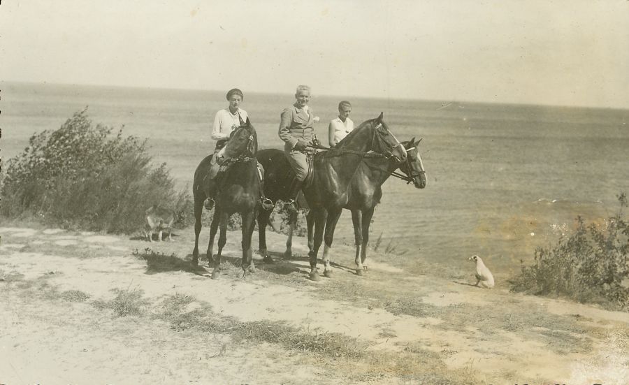| Nr. inwentarzowy: MŁJ-XVI 1640 / 00 / 028 opis: Rajd Poznań-Gdynia, zorganizowany przez Śląski Klub Jazdy Konnej - u celu. W głębi Bałtyk, na klifie, porośniętym z rzadka krzewami uczestnicy rajdu konno: K. Dobrogoyska, St. Grabianowski i R. Brökere w letnich strojach oraz 2 pieski.data: podano początkową i końcową datę rajduczas powstania - daty graniczne: 1933-08-03 - 1933-08-28miejsce: Gdynia - brzeg Bałtykuosoby: Krystyna Dobrogoyska (1902-1975), inż. Stanisław Grabianowski (1889-1957, szef wyprawy), Romana (Roma) Brökere(1909-2001, później Daszkowska)tworzywo: papier fotograficzny, błyszczącytechnika: odbitka żelatynowo-srebrowa DOP, czarno-białazespół: album rodziny Brökerewymiary (wys. x szer.): 86 x 136 [mm]