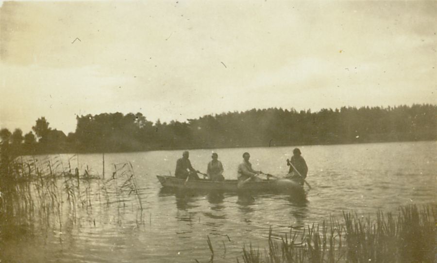 | Nr. inwentarzowy: MŁJ-XVI 1640 / 00 / 017 opis: Rajd Poznań-Gdynia, zorganizowany przez Śląski Klub Jazdy Konnej - popas w Leśnie - pływanie łódką. Cztery osoby płyną łódką przy porośniętym trzcinami brzegu jeziora. Dwie osoby wiosłują, jedna steruje. Widać drugi brzeg zarośnięty drzewami.data: podano początkową i końcową datę rajduczas powstania - daty graniczne: 1933-08-03 - 1933-08-28miejsce: okolice Leśna - osady niedaleko Golubia-Dobrzynia, prawdopodobnie jezioro Okonintworzywo: papier fotograficzny, błyszczącytechnika: odbitka żelatynowo-srebrowa DOP, czarno-białazespół: album rodziny Brökerewymiary (wys. x szer.): 47 x 70 [mm]