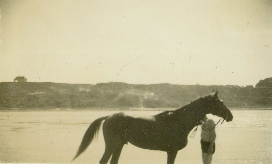 | Nr. inwentarzowy: MŁJ-XVI 1640 / 00 / 015 opis: Rajd Poznań-Gdynia, zorganizowany przez Śląski Klub Jazdy Konnej - pławienie koni w Wiśle. Brzeg rzeki, w tle drugi brzeg, na skarpie domek. W płytkiej wodzie lub na brzegu stoi mężczyzna w spodenkach i podkoszulku z koniem w ogłowiu.data: podano początkową i końcową datę rajduczas powstania - daty graniczne: 1933-08-03 - 1933-08-28miejsce: rzeka Wisła w Grudziądzuosoby: prawdopodobnie inż. Stanisław Grabianowski (1889-1957, szef wyprawy)tworzywo: papier fotograficzny, błyszczącytechnika: odbitka żelatynowo-srebrowa DOP, czarno-białazespół: album rodziny Brökerewymiary (wys. x szer.): 47 x 70 [mm]