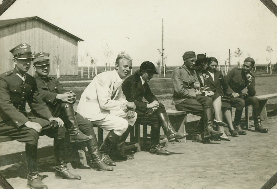 | Nr. inwentarzowy: MŁJ-XVI 1629 / 00 / 032 opis: Uczestnicy zawodów i publiczność odpoczywają na ławkach ustawionych przy placu: 2 podporuczników, Andrzej Potocki (w jasnym stroju jeździeckim), Jadwiga Grotthus (w ciemnym stroju jeździeckim), 2 kobiety w towarzystwie 2 wojskowych. Z tyłu duży drewniany budynek.czas powstania - daty graniczne: 1938-03-01 - 1939-08-31miejsce: Hrubieszów lub okoliceosoby: Andrzej Potocki, Jadwiga Grotthus (1920-2011), córka Gustawa i Anny zd. Chłapowskiejtworzywo: papier fotograficzny, błyszczącytechnika: odbitka żelatynowo-srebrowa DOP, czarno-białazespół: album rodziny Grotthuswymiary (wys. x szer.): 60 x 85 [mm]