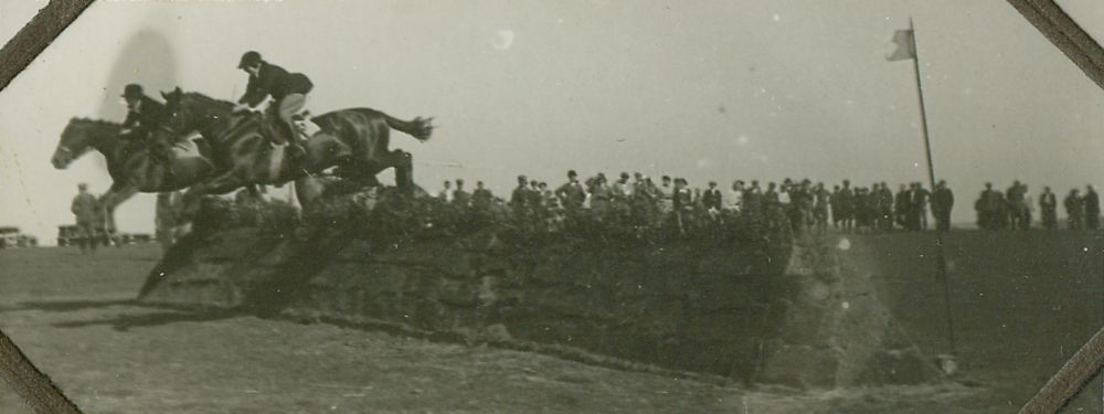 | Nr. inwentarzowy: MŁJ-XVI 1629 / 00 / 028 opis: Bieg myśliwski. Dwie kobiety (bliżej Jadwiga Grotthus) w ciemnych strojach jeździeckich, na koniach ciemnej maści równocześnie skaczą przez wał w kształcie pryzmy; z tyłu liczna publiczność.data: prawdopodobnie jesień 1938czas powstania - daty graniczne: 1938-03-01 - 1938-12-31miejsce: okolice Hrubieszowaosoby: Jadwiga Grotthus (1920-2011), córka Gustawa i Anny zd. Chłapowskiejtworzywo: papier fotograficzny, błyszczącytechnika: odbitka żelatynowo-srebrowa DOP, czarno-białazespół: album rodziny Grotthuswymiary (wys. x szer.): 32 x 81 [mm]
