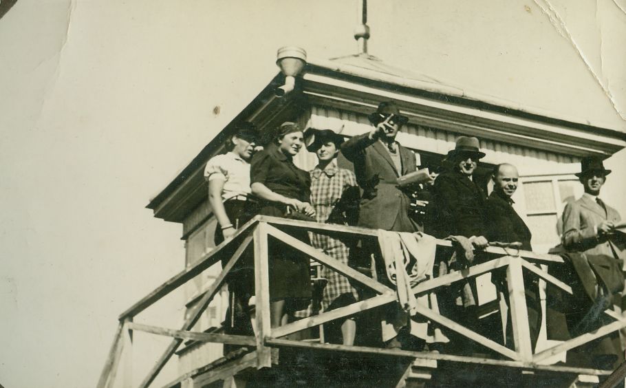 | Nr. inwentarzowy: MŁJ-XVI 1628 / 00 / 065 opis: tor wyścigów konnych w Lublinie, na tarasie drewnianej trybuny stoją 3 kobiety, w tym Jadwiga Grotthus oraz 4 mężczyźni, dwaj trzymają programy wyścigowe lub podobne wydawnictwadata: raczej okres tuż przed II wojną światowączas powstania - daty graniczne: 1935-05-01 - 1939-08-31miejsce: Lublin - Rury n. Bystrzycą, tor wyścigów konnychosoby: Jadwiga Grotthus (1920-2011), córka Gustawa i Anny zd. Chłapowskiejtworzywo: papier fotograficzny, błyszczący, Fabryka Płyt i Papierów Fotograficznych ALFA, Bydgoszcztechnika: odbitka żelatynowo-srebrowa DOP, czarno-białazaklad: Foto Van Dyck, Lublin, Krakowskie Przedmioeście 48zespół: album rodziny Grotthuswymiary (wys. x szer.): 80 x 130 [mm]