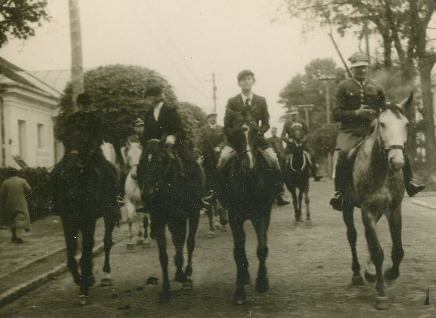 | Nr. inwentarzowy: MŁJ-XVI 1628 / 00 / 060 opis: Rajd konny Hrubieszów - Włodzimierz. Ulicą miasta jedzie konno ok. 8 jeźdźców, w pierwszej czwórce oficer i 3 kobiety, dalej widać cywila i 3 oficerów; z boku dom, słupy trakcji elektrycznej, drzewa.data: 1938 lub 1939 r.czas powstania - daty graniczne: 1938-03-01 - 1939-08-31miejsce: Hrubieszów, Włodzimierz lub Strzyżów albo Uściług - miasteczka położone na trasie rajduinne nazwy własne: Hrubieszowski Klub Jeździecki, 2 Pułk Strzelców Konnych - organizatorzy imprez jeździeckichtworzywo: papier fotograficzny, błyszczący, Agfa-Gevaerttechnika: odbitka żelatynowo-srebrowa DOP, czarno-białazespół: album rodziny Grotthuswymiary (wys. x szer.): 66 x 85 [mm]