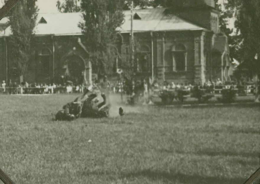 | Nr. inwentarzowy: MŁJ-XVI 1629 / 00 / 029 opis: Zawody w skokach przez przeszkody, upadek konia i jeźdźca. Ogrodzony, trawiasty plac, za ogrodzeniem publiczność, z tyły budynek i drzewa. Widać przeszkodę, kilka metrów za nią (bliżej widza) leżących na trawie - jeźdźca i konia.czas powstania - daty graniczne: 1938-03-01 - 1939-08-31miejsce: Hrubieszówtworzywo: papier fotograficzny, błyszczącytechnika: odbitka żelatynowo-srebrowa DOP, czarno-białazespół: album rodziny Grotthuswymiary (wys. x szer.): 61 x 83 [mm]