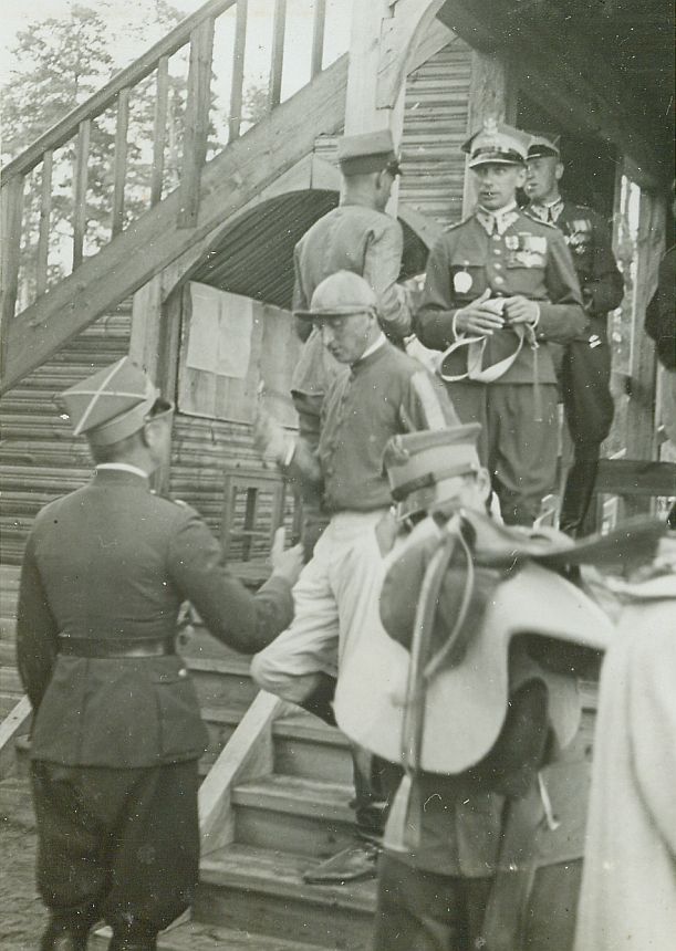 | Nr. inwentarzowy: MŁJ-XVI 1746 / 00 / 094 opis: Tor wyścigów konnych, po Steeple-chase im. Wojewody Wileńskiego Płk. Ludwika Bociańskiego. Na drewnianych schodach prowadzących do wagi i obok nich stoi 7 osób - głównie oficerowie. Na środku Michał Bohdanowicz (strój wyścigowy - białe bryczesy, ciemna kurtka, pasy na rękawach i czapka w podobnym kolorze) w rozmowie ze stojącym tyłem oficerem. Stojący obok ułan trzyma siodło wyścigowe.czas powstania - daty graniczne: 1936-07-16 - 1936-07-16miejsce: Wilno, Pośpieszka.osoby: Rtm. Michał Bohdanowicz "Miś" (1903-1948), 13 p.u., dowódca 1 szwadronu "Tatarskiego".tworzywo: papier fotograficzny, błyszczącytechnika: odbitka żelatynowo-srebrowa DOP, czarno-białazespół: album rodziny Leskichwymiary (wys. x szer.): 117 x 83 [mm]