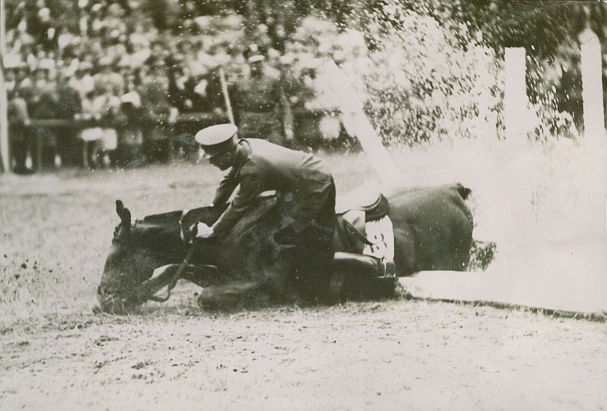 | Nr. inwentarzowy: MŁJ-XVI 1744 / 00 / 080 opis: Międzynarodowe i Krajowe Konkursy Hipiczne w Łazienkach. Plac konkursowy, na pierwszym planie przewracający się koń Imperat z Rumunem kpt. Petre Kirkulescu. Zawodnik w mundurze (okrągła czapka). Numer na jasnym potniku. W tle rozbryzgująca się woda z rowu, publiczność.czas powstania - daty graniczne: 1931-05-28 - 1931-06-08miejsce: Warszawa, hipodrom w Łazienkachosoby: Rumun kpt. Petre Kirkulescu (1889-1975)inne nazwy własne: Kirkulescotworzywo: papier fotograficzny, błyszczącytechnika: odbitka żelatynowo-srebrowa DOP, czarno-białazespół: album rodziny Leskichwymiary (wys. x szer.): 102 x 151 [mm] Koń: 1. Imperat - koń, na którym startował Kirkulescu