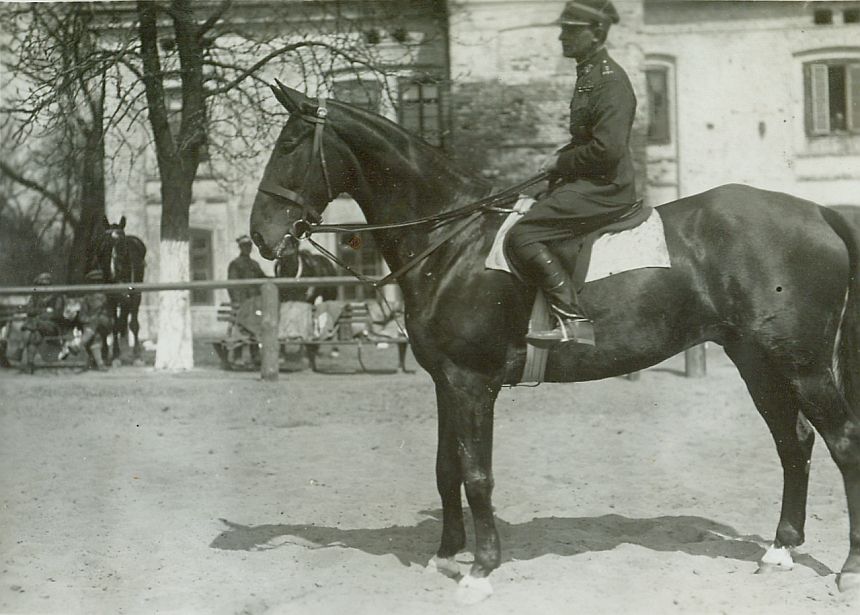 | Nr. inwentarzowy: MŁJ-XVI 1745 / 00 / 065 opis: Płk Karol Rómmel na koniu Aljant. Oficer w mundurze siedzi na stojącym koniu. Piaszczysty plac, za barierką drzewa, ławki, luzacy z końmi, kamienica.data: kwiecieńczas powstania - daty graniczne: 1932-04-01 - 1932-04-30miejsce: Warszawaosoby: Ppłk bar. Karol Rómmel (1888-1967, wybitny jeździec i trener, od 1929 na emeryturze).tworzywo: papier fotograficzny, błyszczącytechnika: odbitka żelatynowo-srebrowa DOP, czarno-białazespół: album rodziny Leskichwymiary (wys. x szer.): 88 x 120 [mm] Koń: 1. Aljant - koń, na którym Karol Rómmel zajął 3 m. w MP w skokach w 1934 r.