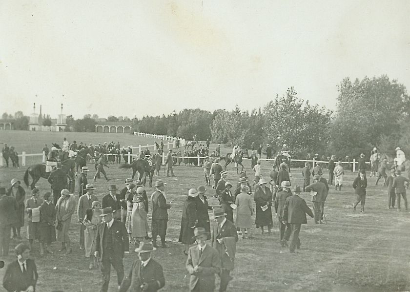 | Nr. inwentarzowy: MŁJ-XVI 1745 / 00 / 028 opis: Wyścigi, widok na padok z głównej trybuny. Prawdopodobnie przed gonitwą - widać kilka koni, niektóre pod jeźdźcami. Kilkadziesiąt osób - publiczność wyścigowa - stoją, przechadzają się, w rękach programy. Dalej białe ogrodzenia, zabudowania wyścigowe, drzewa.data: sierpieńczas powstania - daty graniczne: 1931-08-01 - 1931-08-31miejsce: Piotrków, tor wyścigów konnych.tworzywo: papier fotograficzny, błyszczącytechnika: odbitka żelatynowo-srebrowa DOP, czarno-białazespół: album rodziny Leskichwymiary (wys. x szer.): 83 x 115 [mm]