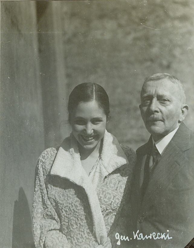 | Nr. inwentarzowy: MŁJ-XVI 1744 / 00 / 032 opis: Tło nieostre, niewyraźne. Wanda Leska uśmiechnięta, w płaszczu w wypukłe wzory, z jasnym kołnierzem i z gołą głową, obok starszy mężczyzna - gen. Roman Kawecki w garniturze. Na jego sylwetce napis: "gen. Kawecki". W kadrze górne części sylwetek.czas powstania - daty graniczne: 1931-03-01 - 1931-03-31miejsce: Warszawaosoby: od lewej: Wanda Leska (1908-1991) i gen. Roman Gozdawa-Kawecki (1868-1938, kawalerzysta, malarz)tworzywo: papier fotograficzny, błyszczącytechnika: odbitka żelatynowo-srebrowa DOP, czarno-białazespół: album rodziny Leskichwymiary (wys. x szer.): 106 x 86 [mm]
