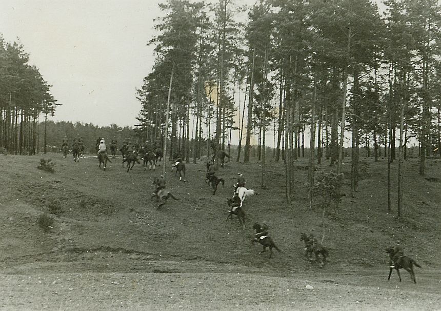 | Nr. inwentarzowy: MŁJ-XVI 1747 / 00 / 003 opis: Bieg św. Huberta Wileńskiej Brygady Kawalerii – na trasie. Kilkanaście osób, głównie wojskowych wjeżdża galopem na pagórek w sosnowym lesie.czas powstania - daty graniczne: 1937-10-17 - 1937-10-17miejsce: Wilno, Pośpieszka.inne nazwy własne: 3 SBK, 3 Samodzielnej Brygady Kawalerii (zmiana nazwy 1 kwietnia 1937)tworzywo: papier fotograficzny, błyszczącytechnika: odbitka żelatynowo-srebrowa DOP, czarno-białazespół: album rodziny Leskichwymiary (wys. x szer.): 60 x 83 [mm]