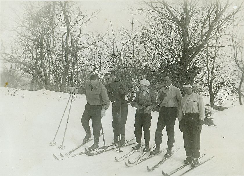 | Nr. inwentarzowy: MŁJ-XVI 1745 / 00 / 063 opis: Na nartach biegowych Anna Leska i oficerowie 14 p.u.: Włodzimierz Korytkowski, Roman Pohorecki, Anna Leska, Jan Pniewski, Zbigniew Halkiewicz. Wszyscy w strojach narciarskich stoją w szeregu na tle zimowego, wiejskiego krajobrazu.data: zima 1932 r.czas powstania - daty graniczne: 1932-01-01 - 1932-03-31osoby: Por. Włodzimierz Korytkowski (1901-?), por. Roman Pohorecki (1903-?), Anna (Anka) Leska, później Leska-Daab (1910-1998), por. Jan Pniewski (1898-?), ppor. Zbigniew Halkiewicz. tworzywo: papier fotograficzny, błyszczącytechnika: odbitka żelatynowo-srebrowa DOP, czarno-białazespół: album rodziny Leskichwymiary (wys. x szer.): 88 x 118 [mm]