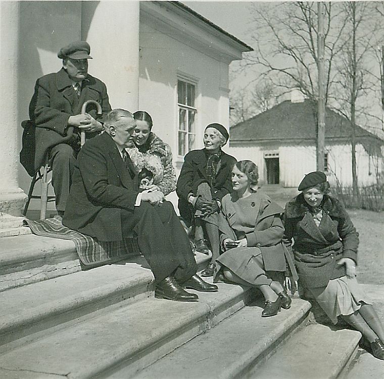 | Nr. inwentarzowy: MŁJ-XVI 1747 / 00 / 035 opis: Wielkanoc, dwór Bohdanowiczów w Stajkach. Przed domem, na schodach ganku: z laską stryj Ignacy, Wacław Narwoysz, Wanda Bohdanowicz, Katarzyna Cywińska, Helena Bohdanowicz, Krystyna Bohdanowicz.czas powstania - daty graniczne: 1938-04-17 - 1938-04-17miejsce: Stajki - majątek Bohdanowiczów, obecnie wieś na Białorusi w rejonie wilejskim, obwodu mińskiegoosoby: Stryj Ignacy - prawdopodobnie Ignacy Bohdanowicz, właściciel maj. Orpa; Wacław Narwoysz (Narwojsz), Wanda Bohdanowicz zd. Leska - żona rtm. Michała Bohdanowicza; Katarzyna Cywińska - nazywana ciocią, prawdopodobnie rodzina Marii Bohdanowicz z Cywińskich, matki Michała, Heleny i Krystyny, Helena i Krystyna Bohdanowiczówny - siostry Michała Bohdanowicza.tworzywo: papier fotograficzny, błyszczącytechnika: odbitka żelatynowo-srebrowa DOP, czarno-białazespół: album rodziny Leskichwymiary (wys. x szer.): 61 x 62 [mm]