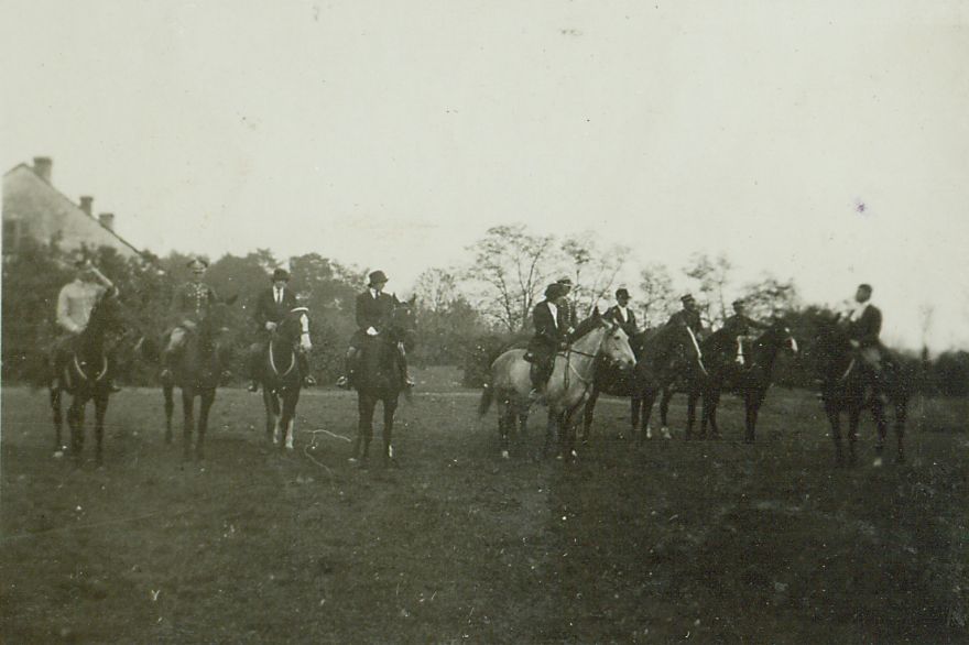 | Nr. inwentarzowy: MŁJ-XVI 1743 / 00 / 071 opis: Łąka, w tle budynek, drzewa. Zbiórka na rozpoczęcie lub zakończenie. W szeregu stoi dziewięcioro jeźdźców na koniach (5 oficerów, 1 cywil i 3 kobiety). Z boku, przed nimi jeździec - cywil. Kobiety we frakach, białych bluzkach, melonikach. Cywile w rajtrokach, jeden w toczku. Konie ciemnej maści, jeden siwy.czas powstania - daty graniczne: 1930-10-01 - 1930-10-31miejsce: Majątek Słaboszewiczów - Ostrowiec koło Wołominatworzywo: papier fotograficzny, błyszczącytechnika: odbitka żelatynowo-srebrowa DOP, czarno-białazespół: album rodziny Leskichwymiary (wys. x szer.): 48 x 70 [mm]