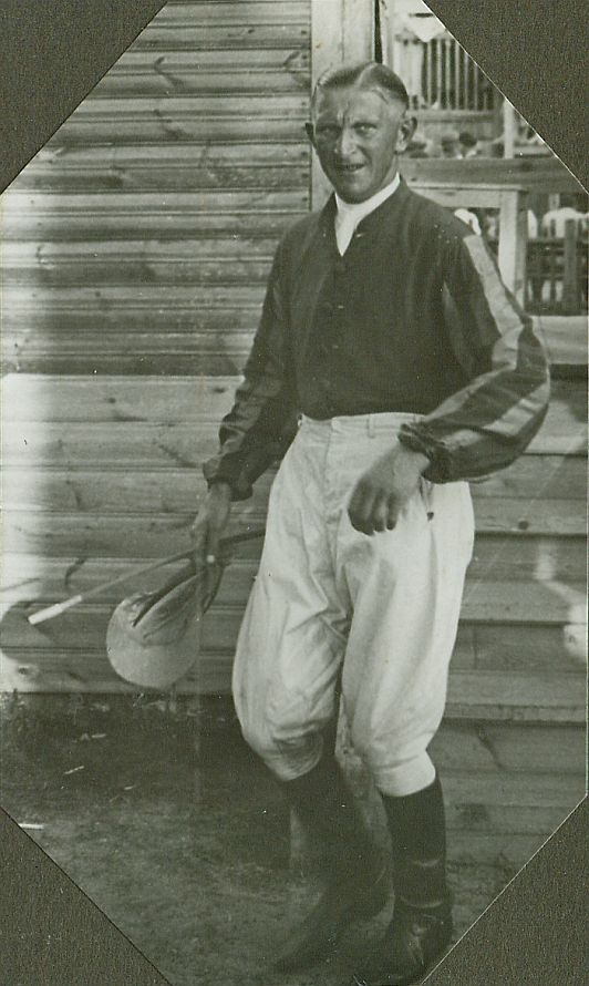 | Nr. inwentarzowy: MŁJ-XVI 1746 / 00 / 070 opis: Tor wyścigów konnych. Michał Bohdanowicz po ciężkim wyścigu - Pod drewnianymi schodami jeździec w stroju wyścigowym - białe bryczesy, ciemna kurtka z jaśniejszymi, podłużnymi pasami na rękawach i jasną czapką i bacikiem w ręku.czas powstania - daty graniczne: 1936-07-05 - 1936-07-12miejsce: Wilno, Pośpieszka.osoby: Rtm. Michał Bohdanowicz "Miś" (1903-1948), 13 p.u., dowódca 1 szwadronu "Tatarskiego".tworzywo: papier fotograficzny, błyszczącytechnika: odbitka żelatynowo-srebrowa DOP, czarno-białazespół: album rodziny Leskichwymiary (wys. x szer.): 111 x 60 [mm]