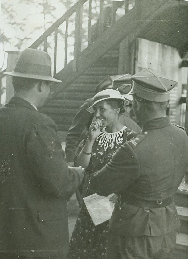 | Nr. inwentarzowy: MŁJ-XVI 1746 / 00 / 036 opis: Tor wyścigów konnych. Przy schodach na trybunę rozmawiają kibice: Jaszwili (garnitur, kapelusz), Wanda Bohdanowicz w sukience z koronkowym kołnierzem i jasnym kapeluszu, Henryk Dobrzański - w mundurze.data: W albumie między wydarzeniami z 2 a 5 lipca 1936 r.czas powstania - daty graniczne: 1936-07-02 - 1936-07-05miejsce: Wilno, Pośpieszka.osoby: Por. Jaszwili 7 p.s.k. Wanda Bohdanowicz zd. Leska (1908-1991), córka Juliusza Leskiego i Marii zd. Olszyńskiej, żona Michała Bohdanowicza. Major Henryk Dobrzański "Hubal" (1897-1940), w 1936 r. 4 p.u., jeździec klasy międzynarodowej, dowódca Oddziału Wydzielonego WP w okresie II wojny światowej.tworzywo: papier fotograficzny, błyszczącytechnika: odbitka żelatynowo-srebrowa DOP, czarno-białazespół: album rodziny Leskichwymiary (wys. x szer.): 118 x 86 [mm]