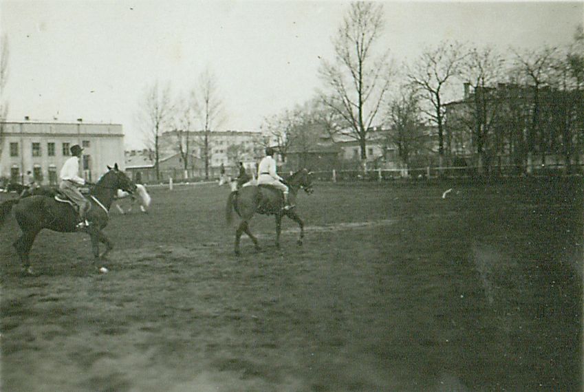 | Nr. inwentarzowy: MŁJ-XVI 1744 / 00 / 039 opis: Fragment ujeżdżalni Szwadronu Sztabowego, kilka kobiet w strojach treningowych jedzie kłusem w kółko. Za nimi ogrodzenie, krzewy, drzewa oraz budynki z jasną elewacją.czas powstania - daty graniczne: 1931-05-01 - 1931-05-31miejsce: Warszawa, ujeżdżalnia Szwadronu Sztabowegotworzywo: papier fotograficzny, błyszczącytechnika: odbitka żelatynowo-srebrowa DOP, czarno-białazespół: album rodziny Leskichwymiary (wys. x szer.): 30 x 42 [mm]