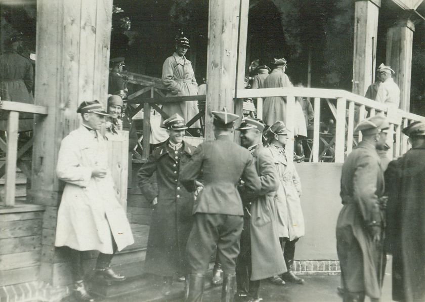 | Nr. inwentarzowy: MŁJ-XVI 1743 / 00 / 051 opis: Na skraju drewnianej trybuny i w jej wnętrzu przy barierce stoi kilkunastu oficerów różnych pułków kawalerii i kobieta. Stoją, rozmawiają, uśmiechają się.czas powstania - daty graniczne: 1930-07-01 - 1930-07-31miejsce: Warszawa, Łazienki, hipodromtworzywo: papier fotograficzny, błyszczącytechnika: odbitka żelatynowo-srebrowa DOP, czarno-białazespół: album rodziny Leskichwymiary (wys. x szer.): 85 x 116 [mm]