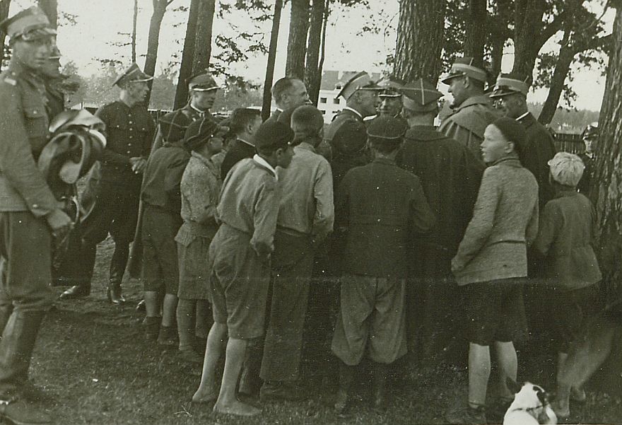 | Nr. inwentarzowy: MŁJ-XVI 1747 / 00 / 058 opis: Tor wyścigów konnych - po wojskowej gonitwie z przeszkodami im. K.O.P. Rokitno. Rtm. Michał Bohdanowicz - opis z albumu: "Miś zaraz po wygraniu otoczony zgrają żulików wileńskich". Najbliżej rtm. Bohdanowicza i z lewej wojskowi, na środku i z prawej grupa chłopców.czas powstania - daty graniczne: 1938-06-16 - 1938-06-16miejsce: Wilno, Pośpieszkaosoby: Rtm. Michał Bohdanowicz (1903-1948), od 1936 w 13 Pułku Ułanów Wileńskich, do 15.05.1938 dowódca 1 szwadronu "Tatarskiego".tworzywo: papier fotograficzny, błyszczącytechnika: odbitka żelatynowo-srebrowa DOP, czarno-białazespół: album rodziny Leskichwymiary (wys. x szer.): 58 x 83 [mm]