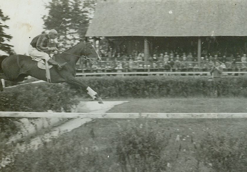 | Nr. inwentarzowy: MŁJ-XVI 1746 / 00 / 083 opis: Tor wyścigów konnych. Steeple-chase im. Wojewody Wileńskiego Płk. Ludwika Bociańskiego. Nad przeszkodą z rowem Michał Bohdanowicz na koniu Nestor. Jeździec w stroju wyścigowym (jasna czapka, ciemna kurtka z jaśniejszymi pasami na rękawach, białe bryczesy). Z przodu bariera, w tle żywopłot, publiczność na trybunie.czas powstania - daty graniczne: 1936-07-16 - 1936-07-16miejsce: Wilno, Pośpieszka.osoby: Rtm. Michał Bohdanowicz "Miś" (1903-1948), 13 p.u., dowódca 1 szwadronu "Tatarskiego". tworzywo: papier fotograficzny, błyszczącytechnika: odbitka żelatynowo-srebrowa DOP, czarno-białazespół: album rodziny Leskichwymiary (wys. x szer.): 84 x 116 [mm] Koń: 1. Nestor - koń, na którym M. Bohdanowicz startował w steeple-chase.