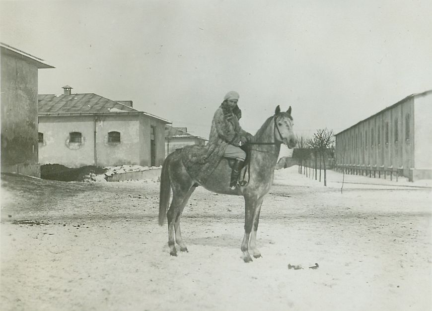 | Nr. inwentarzowy: MŁJ-XVI 1745 / 00 / 057 opis: Anna Leska na koniu Talizman. Amazonka w berecie, futrze, bryczesach i wysokich butach. Koń stoi przy drodze, w tle budynki - stajnie i in. zabudowania związane z końmi.data: marzecczas powstania - daty graniczne: 1932-03-01 - 1932-03-31miejsce: Lwów, prawdopodobnie koszary 14 Pułku Ułanówosoby: Anna (Anka) Leska, później Leska-Daab (1910-1998).tworzywo: papier fotograficzny, błyszczącytechnika: odbitka żelatynowo-srebrowa DOP, czarno-białazespół: album rodziny Leskichwymiary (wys. x szer.): 89 x 118 [mm]