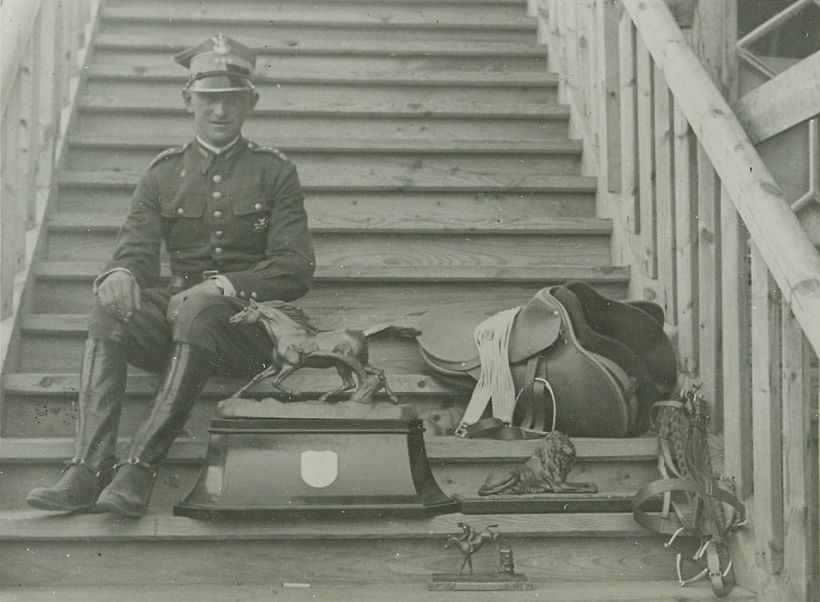 | Nr. inwentarzowy: MŁJ-XVI 1746 / 00 / 119 opis: Tor wyścigów konnych. Na drewnianych schodach siedzi Michał Bohdanowicz ze zdobytymi nagrodami: rzeźba konia na postumencie, rzeźba - lew, rzeźba - jeździec w skoku przez przeszkodę, siodło i ogłowie.czas powstania - daty graniczne: 1936-07-19 - 1936-07-19miejsce: Wilno, Pośpieszka.osoby: Michał Bohdanowicz "Miś" (1903-1948), 13 p.u., dowódca 1 szwadronu "Tatarskiego".tworzywo: papier fotograficzny, błyszczącytechnika: odbitka żelatynowo-srebrowa DOP, czarno-białazespół: album rodziny Leskichwymiary (wys. x szer.): 87 x 116 [mm]