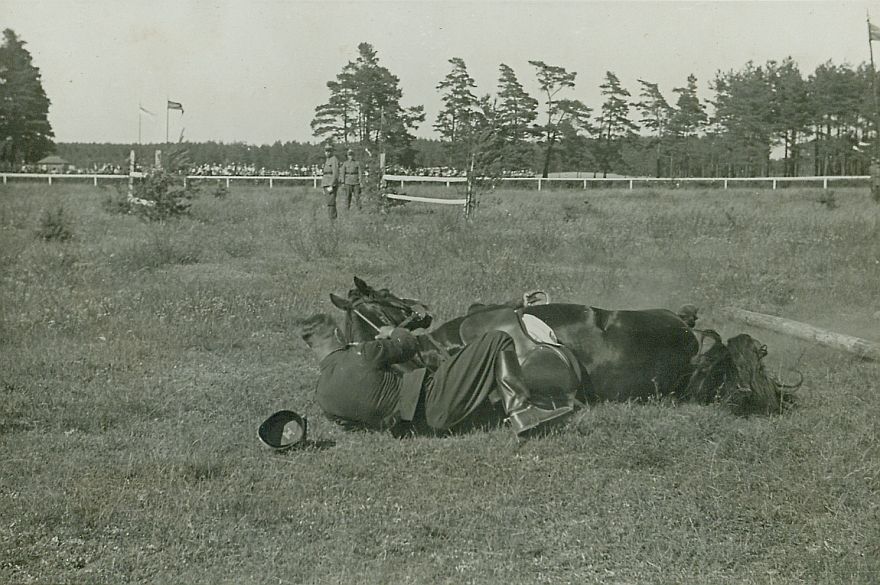 | Nr. inwentarzowy: MŁJ-XVI 1746 / 00 / 003 opis: Tor wyścigów konnych, zawody w skokach przez przeszkody - Konkurs Otwarcia. Plac konkursowy. Po upadku na trawie leży jeździec w mundurze i koń. Za nimi drąg z przeszkody, w tle żołnierze z obsługi toru, inne przeszkody, szranki, drzewa.czas powstania - daty graniczne: 1936-06-28 - 1936-06-28miejsce: Wilno, Pośpieszka.tworzywo: papier fotograficzny, błyszczącytechnika: odbitka żelatynowo-srebrowa DOP, czarno-białazespół: album rodziny Leskichwymiary (wys. x szer.): 86 x 127 [mm]