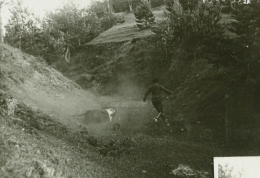 | Nr. inwentarzowy: MŁJ-XVI 1747 / 00 / 062 opis: Okolice toru wyścigów konnych - wojskowy bieg na przełaj im. 13 Pułku Ułanów Wileńskich. Na dnie porośniętego sosnami wąwozu leży po upadku koń. Obok biegnie jego jeździec - por. Krzyszkowski. czas powstania - daty graniczne: 1938-06-12 - 1938-06-26miejsce: Wilno, Pośpieszkaosoby: Por. Krzyszkowski.tworzywo: papier fotograficzny, błyszczącytechnika: odbitka żelatynowo-srebrowa DOP, czarno-białazespół: album rodziny Leskichwymiary (wys. x szer.): 58 x 83 [mm]