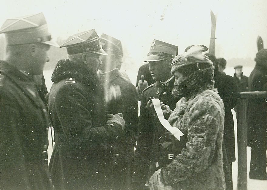 | Nr. inwentarzowy: MŁJ-XVI 1747 / 00 / 027 opis: Zimowe zawody konne. Rtm. Michał Bohdanowicz w rozmowie z płk. Rudolfem Dreszerem, obok stoją ppłk Eugeniusz Święcicki i Wanda Bohdanowicz, która trzyma w ręku wstęgę honorową. W tle inne osoby, narty.czas powstania - daty graniczne: 1938-01-16 - 1938-01-16miejsce: Wilno, Pośpieszkaosoby: Ppłk Eugeniusz Święcicki (1896-1961; z-ca dow. 4 p.u.); płk Rudolf Dreszer (dow. Wileńskiej BK w l. 1937-39); rtm. Michał Bohdanowicz (1903-48, od 1936 w 13 Pułku Ułanów Wileńskich, dow. I Szwadronu Tatarskiego, przed wojną wrócił do 4 p.u.; Wanda Bohdanowicz zd. Leska (1908-91, żona Michała Bohdanowicza).tworzywo: papier fotograficzny, błyszczącytechnika: odbitka żelatynowo-srebrowa DOP, czarno-białazespół: album rodziny Leskichwymiary (wys. x szer.): 60 x 82 [mm]