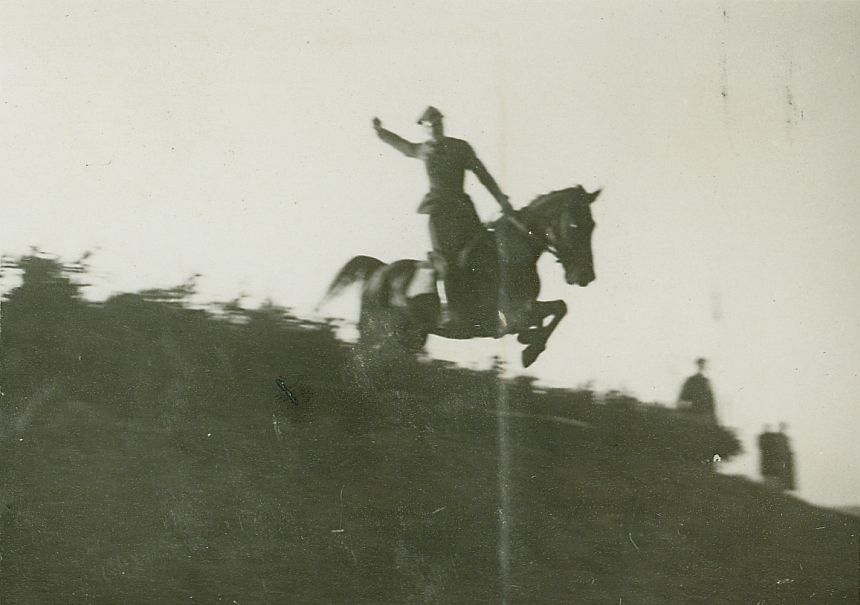 | Nr. inwentarzowy: MŁJ-XVI 1747 / 00 / 011 opis: Bieg św. Huberta w 13 p.u. – ppor. Marian Kisielewicz z podniesioną prawą ręką pokonuje konno przeszkodę terenową - zeskok przez hyrdę.czas powstania - daty graniczne: 1937-10-31 - 1937-10-31miejsce: Nowo-Wilejka.osoby: ppor. Marian Kisielewicz 13 p.u.inne nazwy własne: Nowa Wilejkatworzywo: papier fotograficzny, błyszczącytechnika: odbitka żelatynowo-srebrowa DOP, czarno-białazespół: album rodziny Leskichwymiary (wys. x szer.): 60 x 82 [mm]