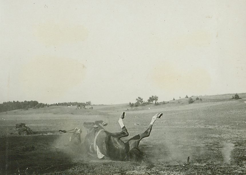 | Nr. inwentarzowy: MŁJ-XVI 1747 / 00 / 069 opis: Okolice toru wyścigów konnych - wojskowy bieg na przełaj im. 14 Pułku Ułanów Jazłowieckich. Po upadku por. Mariana Gierycza (niewidoczny) z koniem - Dyktator leży na grzbiecie.czas powstania - daty graniczne: 1938-06-19 - 1938-06-19miejsce: Wilno, Pośpieszkaosoby: Por. Tadeusz Marian Gierycz (1909-1965) 2 p.u. - niewidoczny.tworzywo: papier fotograficzny, błyszczącytechnika: odbitka żelatynowo-srebrowa DOP, czarno-białazespół: album rodziny Leskichwymiary (wys. x szer.): 59 x 83 [mm] Koń: 1. Dyktator - hod. St. hr. Korzbok-Łącki, wł. M.S.Wojsk., w 1938 roku, w wileńskich biegach na przełaj dosiadali go ppor. Stanisław Bochno i por. Tadeusz Gierycz (obaj 2 p.u.).