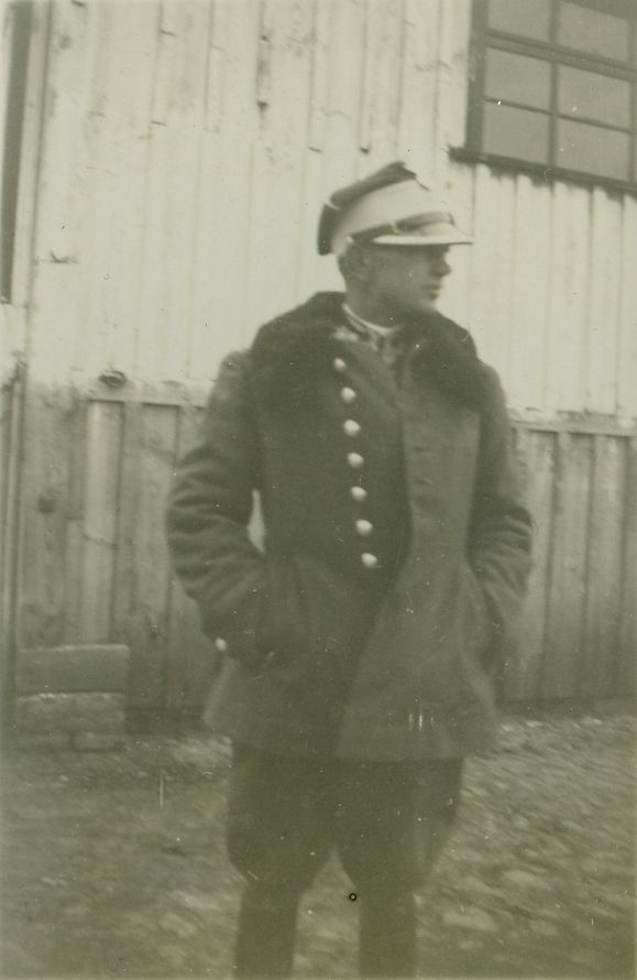 opis: C.W.K., IX Kurs Instruktorów Jazdy Konnej: por. Wiktor Olędzki 2 p.u. - stoi na brukowanej drodze przed budynkiem