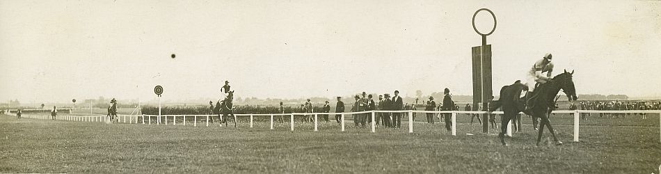 | Nr. inwentarzowy: MŁJ-XVI 1751 / 00 / 021 opis: Tor wyścigów konnych. Wielki Steeple-Chase Armji (Military) dla 4 l. i st. koni, dyst. 4800 m. (nagroda 7000 zł ofiarowana przez Dep. Kaw. i dla jeźdźca zwycięzcy wielki puchar srebrny wędrowny ofiarowany przez Emilię Reszke ze Skrzydlowa. Wygrywa kl. Bianka pod rtm. Kazimierzem Kapiszewskim (barwy stajni K. Kapiszewskiego: k. i r. niebieskie z brązowym pasem, cz. niebieska z brązowym). Dalej finiszują: Kasztelan pod Toczkiem, Dola pod Rómmlem, Boston pod Komorowskim i Chobot pod Bohdanowiczem.czas powstania - daty graniczne: 1927-08-14 - 1927-08-14miejsce: Piotrkówosoby: Rtm. Kazimierz Kapiszewski ur. 1892; w 1923 instr. jazdy konnej w Szkole Oficerskiej Wojsk Taborowych, w 1928 w 21 p.u., w 1930 w 14 p.u.; mjr Michał Toczek 1889-1971 - jeździec klasy międzynarodowej; ppłk bar. Karol Rómmel 1888-1967, wybitny jeździec i trener; mjr Tadeusz Komorowski 1895-1966, późniejszy gen. „Bór”, dowódca AK i powstania warszawskiego, Naczelny Wódz PSZ na Zachodzie; por. Michał Bohdanowicz 1903-1948.tworzywo: papier fotograficzny, półbłyszczącytechnika: odbitka żelatynowo-srebrowa DOP, czarno-białazespół: album rodziny Bohdanowiczówwymiary (wys. x szer.): 63 x 232 [mm] Konie: 1. Bianka, klacz, rasa: xx, maść ciemnogniada, ur. 1922 - Carabas — Bodrog, hod. Bohdana Ziętarskiego, wł. od 1927 rtm. Kapiszewski, 1930 Gr. of. 21 p.u. Biegała w 2. poł. l. 20. XX w. w gonitwach płaskich, płotowych i przeszkodowych na torach w Łodzi, Lwowie, Piotrkowie, Przemyślu, Poznaniu, Grudziądzu, Bydgoszczy, Lublinie, Radomiu, Wilnie. Dosiadali jej: rtm. K. Kapiszewski (także trener), p. Zakrzeński, p. Kruszewski, chł. Domaszewski.