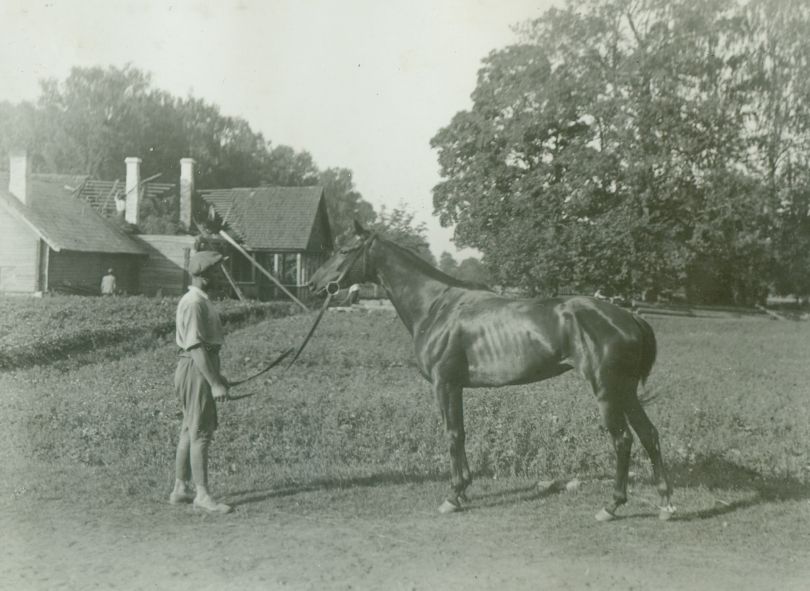 | Nr. inwentarzowy: MŁJ-XVI 1757 / 00 / 026 opis: Tor wyścigów konnych lub jego okolice. Mężczyzna w treningowym stroju jeździeckim (bryczesy i pantofle) prezentuje klacz Anna Belle. Koń z błyszczącą sierścią, w kondycji wyścigowej, w prostym ogłowiu. Klacz stoi przed mężczyzną, który trzyma ją za wodze.data: czerwiec-lipiec 1934 r.czas powstania - daty graniczne: 1934-06-01 - 1934-07-31miejsce: Wilno, Pośpieszkatworzywo: papier fotograficzny, błyszczącytechnika: odbitka żelatynowo-srebrowa DOP, czarno-białazespół: album rodziny Bohdanowiczówwymiary (wys. x szer.): 82 x 108 [mm] Koń: 1. Anna Belle, klacz, rasa: xx, maść skarogniada, ur. 1930 - Illuminator i Beluga, hod. Konstantego Biskupskiego, wł. T. Bruszewskiego, później grona oficerów 14 p.u., startowała w wyścigach płaskich, płotowych i przeszkodowych na torach w Warszawie, Łodzi, Lublinie, Lwowie, Zakopanem i Wilnie w l. 1931-1935, m.in. pod M. Bohdanowiczem i Wł. Korytkowskim, który ją także trenował. Opisywana także jako ciemnogniada.