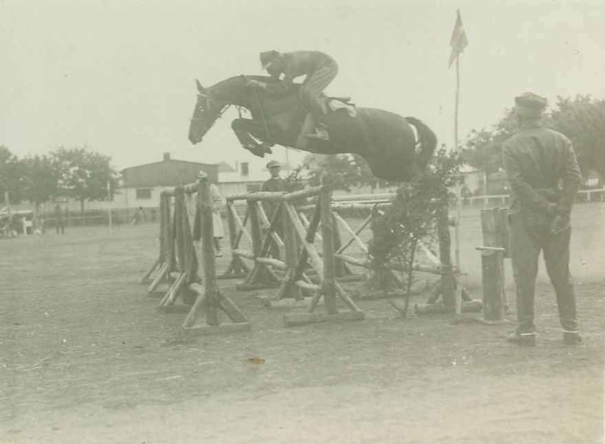 | Nr. inwentarzowy: MŁJ-XVI 1519 / 00 / 028 opis: por. Wojciech Biliński na koniu Florek Siłacz skacze przez triple-barre z kratownicy z drągów, przy przeszkodzie 3 wojskowych; ujeżdżalnia CWKdata: raczej połowa l. 30., bo w 1930 r. Florek miał tylko 6 lat, a przeszkoda jest poważnaczas powstania - daty graniczne: 1930-04-01 - 1935-09-30miejsce: Polska, Grudziądz, C.W.K. [Centrum Wyszkolenia Kawalerii]osoby: Wojciech Biliński (1903-?); 1931 - pierwszy mistrz Polski w skokach, w grupie olimpijskiej przed IO w 1932; udane występy w PN, por., od 1934 r. kpt.; C.W.A. Toruń, S.P.A. (Szkoła Podch. Art.), 24 p.uł.inne nazwy własne: CWA, C.W.Art., Centrum Wyszkolenia Artylerii w Toruniutworzywo: papier fotograficzny, błyszczącytechnika: odbitka żelatynowo-srebrowa DOP, czarno-białazespół: album rodziny Nieniewskichwymiary (wys. x szer.): 89 x 120 [mm] Koń: 1. Florek Siłacz, wałach, rasa: x, maść gniada, ur. 1924 - Huszar II - Lüsette, hod. K. Wickenhagen, wł. W. Bilińskiego, który startował na nim w 2. poł. l. 30. - m.in. starty w Warszawie, 1936-37 II m. w MP w skokach, w l. 1938-39 starty w Mitingach Popularnych PZJ w Wilnie