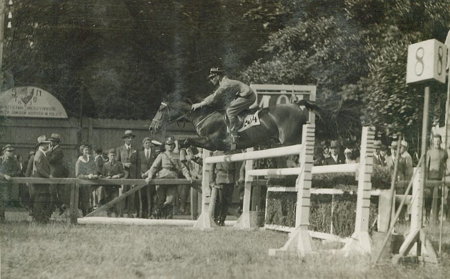 | Nr. inwentarzowy: MŁJ-XVI 1744 / 00 / 071 opis: Międzynarodowe i Krajowe Konkursy Hipiczne w Łazienkach. Por. Paweł Dąbski-Nerlich w skoku na gniadym koniu Nero przez triplebarre nr 8. Na potniku numer. Za szrankami kibice. W tle drzewa i tablica z napisem Stadjon […]warzystwa Międzynarodowych […]wych Zawodów Konnych w Polsce.czas powstania - daty graniczne: 1931-05-28 - 1931-06-08miejsce: Warszawa, hipodrom w Łazienkachosoby: Paweł Dąbski-Nerlich (1899-1983) 7 DAKinne nazwy własne: Towarzystwo Międzynarodowych i Krajowych Zawodów Konnych w Polscetworzywo: papier fotograficzny, półbłyszczącytechnika: odbitka żelatynowo-srebrowa DOP, czarno-białazespół: album rodziny Leskichwymiary (wys. x szer.): 83 x 132 [mm] Koń: 1. Nero, wałach, maść gniada