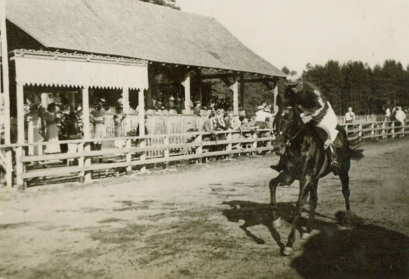 | Nr. inwentarzowy: MŁJ-XVI 1757 / 00 / 046 opis: Tor wyścigów konnych, gonitwa z płotami na dyst. 2800 m. Wzdłuż prostej z trybunami galopuje por. Michał Bohdanowicz (we własnych barwach: k. amarantowa, r. w podłużne pasy amarantowe i złote, cz. złota) na koniu Czaruś. Czaruś wygrał ten wyścig i wcześniejszą o dwa dni gonitwę przeszkodową na dyst. 3000 m. Na trybunie publiczność.czas powstania - daty graniczne: 1934-07-19 - 1934-07-19miejsce: Wilno, Pośpieszkaosoby: Por. Michał Bohdanowicz 1903-1948 (syn Jana Bohdanowicza i Marii z Cywińskich. W latach 1932-36 i przed II wojną w 4 Pułku Ułanów Zaniemeńskich, nazywany "Misiem", mąż Wandy zd. Leskiej, miłośnik wyścigów płotowych, przeszkodowych i biegów na przełaj).tworzywo: papier fotograficzny, błyszczącytechnika: odbitka żelatynowo-srebrowa DOP, czarno-białazespół: album rodziny Bohdanowiczówwymiary (wys. x szer.): 58 x 83 [mm] Koń: 1. Czaruś, wałach, rasa: xx, maść skarogniada - po Blue Danube i Sirene, hod. Antoniego Białkowskiego, wł. i tr. E. Sobański. W 1934 r. startował 9 razy w gonitwach płotowych i przeszkodowych, na torach w Wilnie i Lwowie, wygrał 3 razy, w tym 17 lipca (przeszkody, j. Jeliaszewicz) i 19 lipca (płoty, j. Bohdanowicz) w Wilnie.