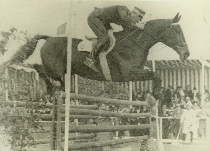 | Nr. inwentarzowy: MŁJ-XVI 1639 / 00 / 018 opis: Rtm. Aleksander Rylke skacze przez okser na koniu Bimbus. Koń w rzędzie sportowym, ogłowie wędzidłowe, wytok, na potniku niewyraźny numer. W tle trybuny pod namiotami w pasy, publiczność.czas powstania - daty graniczne: 1939-04-15 - 1939-04-24miejsce: Niceaosoby: rtm. Aleksander Rylke 14 p.u.tworzywo: papier fotograficzny, matowytechnika: odbitka żelatynowo-srebrowa z wydrukuzespół: album Clemensa Nagla Międzynarodowi artyści w jeździe przez przeszkodywymiary (wys. x szer.): 124 x 175 [mm] Koń: 1. Bimbus, wałach, maść gniada - kariera tuż przed II wojną światową, reprezentował nas w Pucharach Narodów, koń klasy międzynarodowej