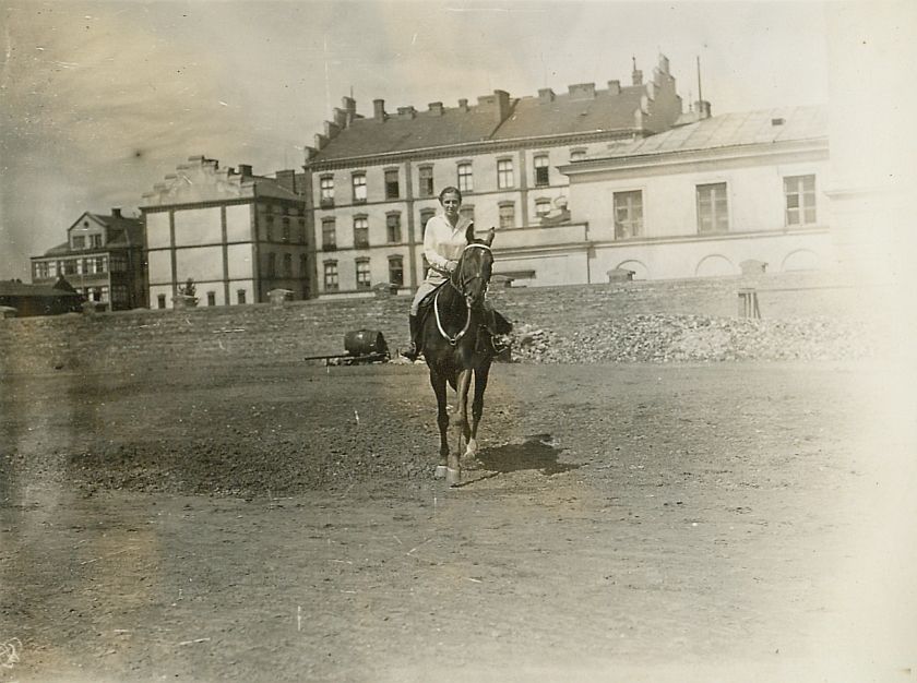 | Nr. inwentarzowy: MŁJ-XVI 1745 / 00 / 015 opis: Ujeżdżalnia - plac treningowy, w tle budynki. Na stępującym koniu Kazik siedzi Anna Leska w stroju jeździeckim, z gołą głową.data: sierpieńczas powstania - daty graniczne: 1931-08-01 - 1931-08-31miejsce: Warszawa, ul. Koszykowa 79, Wyższa Szkoła Wojenna, ujeżdżalnia.osoby: Anna (Anka) Leska, później Leska-Daab (1910-1998).inne nazwy własne: W.S.W - WSW - W.S.Woj. - Wyższa Szkoła Wojennatworzywo: papier fotograficzny, błyszczącytechnika: odbitka żelatynowo-srebrowa DOP, czarno-białazespół: album rodziny Leskichwymiary (wys. x szer.): 85 x 114 [mm] Koń: 1. Kazik, wałach, maść skarogniada, ur. 1925 - Rock-Roy – Merilla, hod. H. Jechalskiego, wł. Wandy Leskiej-Bohdanowicz; w 1930 roku właścicielka trenowała go na ujeżdżalni W.S.Woj., startowała na nim m.in. w Warszawie, podczas Krajowych Zawodów Konnych w 1932 r.; w 1933 r. wygrywali na nim biegi przełajowe M. Bohdanowicz i J. Domański. W 1937 r. startował w Grudziądzu i Gnieźnie