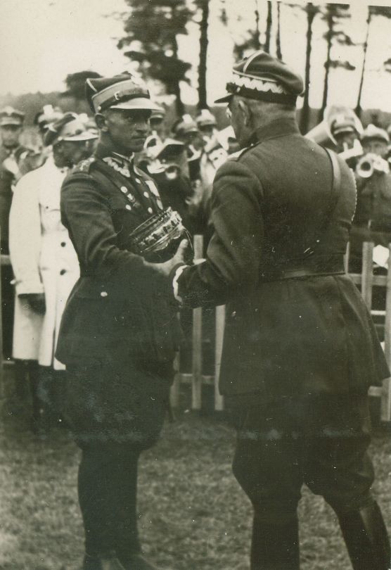 | Nr. inwentarzowy: MŁJ-XVI 1757 / 00 / 034 opis: Tor wyścigów konnych, po cross-country im. gen. Gustawa Orlicz-Dreszera. Gen. Marian Przewłocki wręcza por. Michałowi Bohdanowiczowi nagrodę - puchar im. gen. Gustawa Orlicz-Dreszera za wygrany na koniu Równy bieg na przełaj. W tle oficer w jasnym płaszczu i wojskowa orkiestra.czas powstania - daty graniczne: 1934-07-08 - 1934-07-08miejsce: Wilno, Pośpieszkaosoby: Por. Michał Bohdanowicz 1903-1948 (syn Jana Bohdanowicza i Marii z Cywińskich. W latach 1932-36 i przed II wojną w 4 Pułku Ułanów Zaniemeńskich, nazywany "Misiem", mąż Wandy zd. Leskiej, miłośnik wyścigów płotowych, przeszkodowych i biegów na przełaj); gen. bryg. Marian Przewłocki 1888-1966 (w 1935 r. dowódca 3 Samodzielnej Brygady Kawalerii w Wilnie; prezes Wileńskiego Towarzystwa .Hodowli i Popierania Sportu Konnego).tworzywo: papier fotograficzny, błyszczącytechnika: odbitka żelatynowo-srebrowa DOP, czarno-białazespół: album rodziny Bohdanowiczówwymiary (wys. x szer.): 82 x 57 [mm] Koń: 1. Równy, wałach, rasa: półkrwi, maść skarogniada - po Konwent i Powaga, hod. St. Ciemniewski, wł. rtm. K. Choroszewski. Startowali na nim w biegach na przełaj i steeple-chase M. Bohdanowicz i wł. Żelewski, na zdjęciu: nie ma go na zdjęciu, 1. miejsce