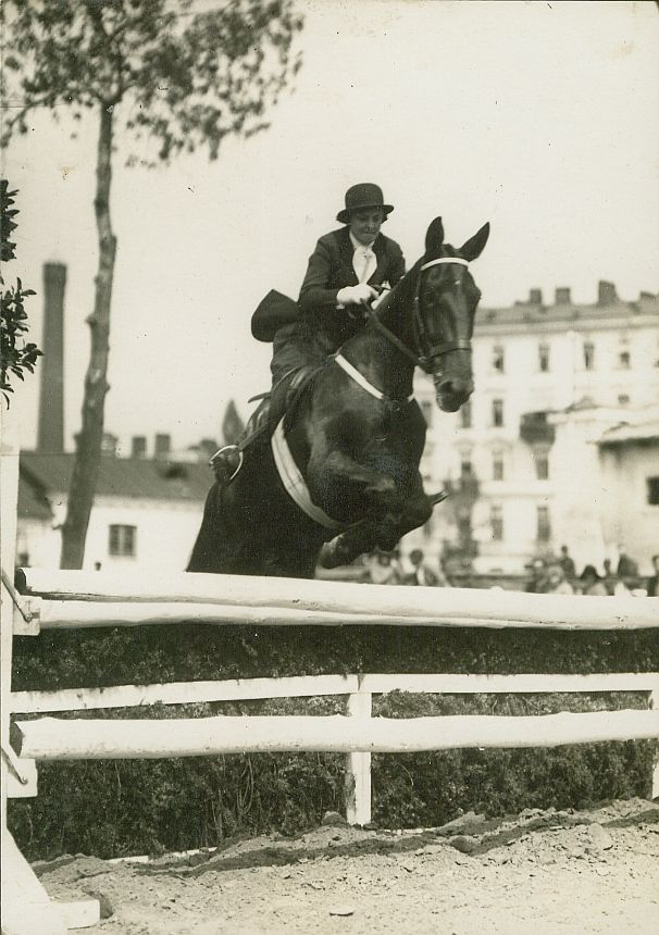 | Nr. inwentarzowy: MŁJ-XVI 1744 / 00 / 059 opis: Konkurs Klubu Sportowego Rodziny Wojskowej. Plac konkursowy, przez jasny okser z hyrdą na koniu ciemnej maści The Lad skacze Adela Skarżyńska (melonik, ciemny frak i bryczesy). Koń w sportowym rzędzie, widać jasny popręg, naczółek i napierśnik. Z tyłu drzewo, budynki z jasną elewacją.czas powstania - daty graniczne: 1931-05-14 - 1931-05-14miejsce: Warszawa, ujeżdżalnia Szwadronu Sztabowegoosoby: Adela Skarżyńska (1897-1997), wówczas żona Kazimierza Skarżyńskiegotworzywo: papier fotograficzny, półbłyszczącytechnika: odbitka żelatynowo-srebrowa DOP, czarno-białazespół: album rodziny Leskichwymiary (wys. x szer.): 169 x 120 [mm] Koń: 1. The Lad, wałach, maść gniada, ur. 1920 - wł. K. Skarżyńskiego, hod. ang., jeździła na nim także Adela Skarżyńska, na zdjęciu: 11 lat
