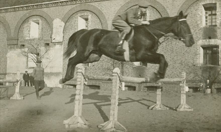 | Nr. inwentarzowy: MŁJ-XVI 1641 / 00 / 019 opis: Plac - ujeżdżalnia(?) obok ceglanego budynku z okolonymi łukami oknami i fryzem. Na koniu Nabab przez szereg doublebarre-okser skacze E. Brabec (długie buty, kaszkiet, marynarka, bryczesy). Z tyłu kilka osób.czas powstania - daty graniczne: 1930-01-01 - 0000-00-00miejsce: Polskaosoby: Eryk [Ija] Brabec z Poznania (1916-1996, późniejszy wieloletni Sekretarz Generalny PZJ)tworzywo: papier fotograficzny, półbłyszczącytechnika: odbitka żelatynowo-srebrowa DOP, czarno-białazespół: album rodziny Brökerewymiary (wys. x szer.): 88 x 139 [mm] Koń: 1. Nabab, wałach, maść skarogniada - hod. węgierskiej, wł. płk. Hubert Brabec