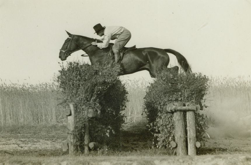 | Nr. inwentarzowy: MŁJ-XVI 1743 / 00 / 041 opis: Trening - Kazimierz Skarżyński skacze w terenie przez szeroki okser-hyrdę. W tle łan zboża. Koń The Lad, widać ogłowie wędzidłowe z nachrapnkiem angielskim i sportowe siodło. Jeździec w kapeluszu, jasnej koszuli, bryczesach i długich butach z ostrogami.czas powstania - daty graniczne: 1930-06-01 - 1930-06-30miejsce: Warszawa, Moczydłoosoby: Kazimierz Skarżyński (1887-1962) - jeździec cywilny, poliglota, z ramienia PCK uczestniczył w organizowanym przez Niemców w 1943 r. wyjeździe do Lasu Katyńskiego, autor „Raportu z Katynia"tworzywo: papier fotograficzny, półmatowytechnika: odbitka żelatynowo-srebrowa DOP, czarno-białazespół: album rodziny Leskichwymiary (wys. x szer.): 110 x 166 [mm] Koń: 1. The Lad, wałach, maść gniada, ur. 1920 - wł. K. Skarżyńskiego, hod. ang., jeździła na nim także Adela Skarżyńska, na zdjęciu: 10 lat