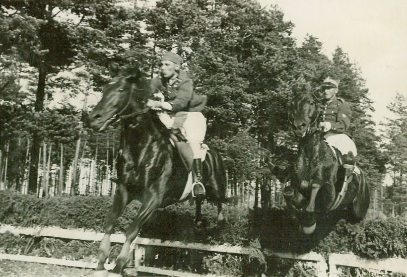 | Nr. inwentarzowy: MŁJ-XVI 1758 / 00 / 011 opis: Tor wyścigów konnych. Wojskowy bieg na przełaj „Budsławia". Na przeszkodzie - płocie od lewej: kpt. Rozwadowski na koniu Ellis i rtm. Michał Bohdanowicz na koniu Równy. Jeźdźcy w mundurach i jasnych bryczesach ( Rozwadowski w furażerce, Bohdanowicz w rogatywce).czas powstania - daty graniczne: 1935-06-30 - 1935-07-21miejsce: Wilno, Pośpieszkaosoby: Kpt. Rozwadowski (prawdopodobnie Kazimierz Michał Rozwadowski ur. 1898, 19 p.a.l.); rtm. Michał Bohdanowicz 1903-1948 ("Miś", syn Jana Bohdanowicza i Marii z Cywińskich. W latach 1932-1936 w 4 Pułku Ułanów Zaniemeńskich).tworzywo: papier fotograficzny, błyszczącytechnika: odbitka żelatynowo-srebrowa DOP, czarno-białazespół: album rodziny Bohdanowiczówwymiary (wys. x szer.): 87 x 124 [mm] Konie: 1. Ellis, ogier, rasa: półkrwi, ur. 1930 - po Priesterwald i Allegra, hod. Towarzystwo Popierania Hodowli Konia Pełnej Krwi 17 p.u., koń, na którym w 1935 r. w Wilnie-Pośpieszce startował w biegu na przełaj "Budsławia" kpt. Rozwadowski, na zdjęciu: z lewej 2. Równy, wałach, rasa: półkrwi, maść skarogniada - po Konwent i Powaga, hod. St. Ciemniewski, wł. rtm. K. Choroszewski. Startowali na nim w biegach na przełaj i steeple-chase M. Bohdanowicz i wł. Żelewski, na zdjęciu: z prawej