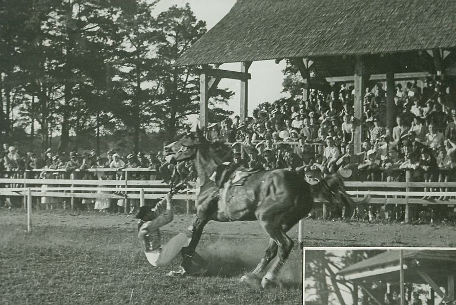 | Nr. inwentarzowy: MŁJ-XVI 1746 / 00 / 020 opis: Tor wyścigów konnych, Steeple-chase im. Brygady K.O.P. Wilno. Upadek po skoku - Edward Tudziński spada z kl. Felka. Jeździec w stroju wyścigowym (jasne bryczesy, kolorowa kurtka, ciemna czapka), trzyma się wodzy. Za barierą drewniana trybuna wypełniona publicznością, kilka drzew. Niewidoczne na zdjęciu: wygrała kl. Złota Pantera - Paweł Bierzyński, 2. m. koń Natan R - dr Zajączkowski.czas powstania - daty graniczne: 1936-06-28 - 1936-06-28miejsce: Wilno, Pośpieszka.osoby: Edward Tudziński (por. w szwadronie zapasowym 26 p.u., właściciel stajni wyścigowej – barwy: E. Tudziński: k. i r. różowe, sz. i cz. czarne), jego konie startowały we Lwowie, Wilnie, Baranowiczach);; niewidoczni: rtm. Paweł Bierzyński (1897-1946), od 1931 w 6 p.s.k. - d-ca szwadronu zapasowego; dr Zajączkowski.tworzywo: papier fotograficzny, błyszczącytechnika: odbitka żelatynowo-srebrowa DOP, czarno-białazespół: album rodziny Leskichwymiary (wys. x szer.): 87 x 125 [mm] Konie: 1. Felka, klacz, rasa: xx, maść gniada, ur. 1931 - po Svengali i Walkirja, hod. Janusza Michelisa, wł. por. Edwarda Tudzińskiego; w 1935 biegała w gonitwach płotowych w Poznaniu, Wilnie, Lublinie; startowała także w steeple-chase pod por. E. Tudzińskim i por. B. Miklewskim. 2. Złota Pantera, klacz - koń, na którym w steeple-chase startował P. Bierzyński., na zdjęciu: niewidoczna na zdjęciu 3. Natan R - koń, na którym w steeple-chase startował dr Zajączkowski., na zdjęciu: niewidoczny na zdjęciu
