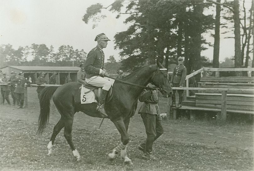 | Nr. inwentarzowy: MŁJ-XVI 1758 / 00 / 056 opis: Tor wyścigów konnych, bieg na przełaj 10 Pułku Ułanów Litewskich. Po zwycięstwie rtm. Michał Bohdanowicz na koniu Tudor wraca do wagi. Konia prowadzi żołnierz. M. Bohdanowicz w mundurze i jasnych bryczesach, Tudor w ochraniaczach na przednich nogach, na potniku numer 5. W tle zabudowania toru, wojskowi.czas powstania - daty graniczne: 1935-07-14 - 1935-07-14miejsce: Wilno, Pośpieszkaosoby: Rtm. Michał Bohdanowicz 1903-1948 ("Miś", syn Jana Bohdanowicza i Marii z Cywińskich. W latach 1932-1936 w 4 Pułku Ułanów Zaniemeńskich).tworzywo: papier fotograficzny, błyszczącytechnika: odbitka żelatynowo-srebrowa DOP, czarno-białazespół: album rodziny Bohdanowiczówwymiary (wys. x szer.): 85 x 125 [mm] Koń: 1. Tudor, rasa: x, maść ciemnogniada, ur. 1925 - po Tankäuser II xx i Elegantka, hod. J. Jakubowski; koń, na którym w biegach na przełaj w 2. poł. l. 30. XX w. startowali: por. Bukowski, por. R. Pohorecki, por. J. Domański i rtm. M. Bohdanowicz., na zdjęciu: 1. miejsce