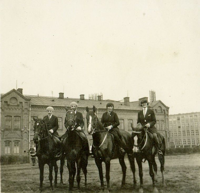 | Nr. inwentarzowy: MŁJ-XVI 1753 / 00 / 113 opis: Na stojących koniach do zdjęcia pozuja od lewej: Anna Leska na klaczy Młynarka, Wanda Leska na koniu Kazik, Melania Biskupska na koniu Amor i Janina Słaboszewicz na swoim koniu Mandaryn. Wszystkie kobiety w treningowych strojach jeździeckich.data: kwiecień 1930 r.czas powstania - daty graniczne: 1930-04-01 - 1930-04-30miejsce: Warszawa, ul. Koszykowa 79, Wyższa Szkoła Wojenna, ujeżdżalnia położona w kwartale: Koszykowa – Krzywickiego/Sucha – 6 Sierpnia/Nowowiejska – Topolowa/Al. Niepodległościosoby: Anna Leska 1910-1998 ("Anka", członkini K.S.R.W.; później Leska-Daab, podczas II wojny światowej pilot w Wielkiej Brytanii); Wanda Leska 1908-1991 (siostra Anny i Kazimierza, później żona Michała Bohdanowicza); Melania Biskupska 1901-1982 ("Biskupicz", z domu Kasior, s.v. Nawrocka); Janina Kirn-Słaboszewicz 1910-1975 (Nina, Ninula, po mężu Lipkowska, ziemianka, amazonka).inne nazwy własne: W.S.W - WSW - W.S.Woj. - Wyższa Szkoła Wojennatworzywo: papier fotograficzny, błyszczącytechnika: odbitka żelatynowo-srebrowa DOP, czarno-białazespół: album rodziny Bohdanowiczówwymiary (wys. x szer.): 59 x 61 [mm] Konie: 1. Młynarka, klacz - koń, na którym w 1930 roku trenowała na ujeżdżalni W.S.Woj. Anna Leska 2. Kazik, wałach, maść skarogniada, ur. 1925 - Rock-Roy – Merilla, hod. H. Jechalskiego, wł. Wandy Leskiej-Bohdanowicz; w 1930 roku właścicielka trenowała go na ujeżdżalni W.S.Woj., startowała na nim m.in. w Warszawie, podczas Krajowych Zawodów Konnych w 1932 r.; w 1933 r. wygrywali na nim biegi przełajowe M. Bohdanowicz i J. Domański. W 1937 r. startował w Grudziądzu i Gnieźnie 3. Amor - koń, na którym w 1930 roku trenowała Melania Biskupska 4. Mandaryn, wałach, maść kasztanowata, ur. 1920 - hod. NN, wł. Niny Słaboszewicz; oprócz właścicielki dosiadała go Anna Leska