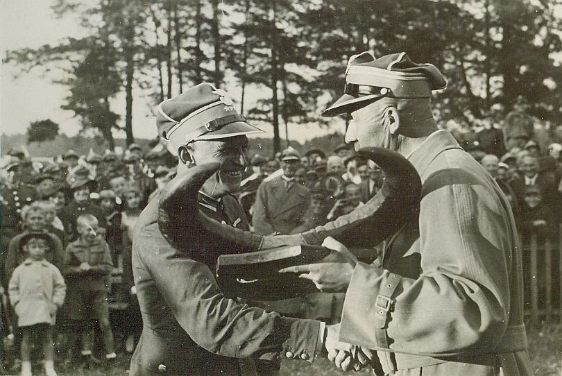 | Nr. inwentarzowy: MŁJ-XVI 1758 / 00 / 033 opis: Tor wyścigów konnych. Rtm. Michał Bohdanowicz odbiera nagrodę za zwycięstwo na klaczy Anna Belle w Steeple-chase Mejszagoły. Nagrodę - oprawione rogi bawoła indyjskiego - wręcza płk Czesław Kozierowski. W tle liczni kibice.czas powstania - daty graniczne: 1935-07-07 - 1935-07-07miejsce: Wilno, Pośpieszkaosoby: Rtm. Michał Bohdanowicz 1903-48 (syn Jana Bohdanowicza i Marii z Cywińskich. W latach 1932-36 i przed II wojną w 4 p.u., nazywany "Misiem", w 1935 r. wygrał 12 gonitw podczas mitingu wyścigowego w Wilnie); płk.Czesław Kozierowski 1890-1940 Charków (do 1932 dow. 4 p.u., potem O.T.O., lubiany, popierał sport i wyścigi, bardzo aktywny jako wiceprezes Wileńskiego Towarzystwa Hodowli Koni i Popierania Sportu Konnnego).inne nazwy własne: O.T.O. - Oficerski Trybunał Orzekającytworzywo: papier fotograficzny, błyszczącytechnika: odbitka żelatynowo-srebrowa DOP, czarno-białazespół: album rodziny Bohdanowiczówwymiary (wys. x szer.): 85 x 125 [mm] Koń: 1. Anna Belle, klacz, rasa: xx, maść skarogniada, ur. 1930 - Illuminator i Beluga, hod. Konstantego Biskupskiego, wł. T. Bruszewskiego, później grona oficerów 14 p.u., startowała w wyścigach płaskich, płotowych i przeszkodowych na torach w Warszawie, Łodzi, Lublinie, Lwowie, Zakopanem i Wilnie w l. 1931-1935, m.in. pod M. Bohdanowiczem i Wł. Korytkowskim, który ją także trenował. Opisywana także jako ciemnogniada., na zdjęciu: nie ma jej na zdjęciu, 1. miejsce