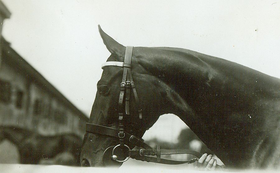 | Nr. inwentarzowy: MŁJ-XVI 1754 / 05 / 023 opis: Portret konia Kazik - głowa i szyja, ogłowie z nachrapnikiem polskim, dolna część nosa "obcięta" - prześwietlony fragment. Za wodze trzyma niewidoczna osoba - widać tylko dłoń. W tle drugi koń, budynek.data: czerwiec 1932 r.czas powstania - daty graniczne: 1932-06-01 - 1932-06-30miejsce: Warszawa, ul. Koszykowa 79, Wyższa Szkoła Wojenna, ujeżdżalniainne nazwy własne: W.S.W - WSW - W.S.Woj. - Wyższa Szkoła Wojennatworzywo: papier fotograficzny, błyszczącytechnika: odbitka żelatynowo-srebrowa DOP, czarno-białazespół: album rodziny Bohdanowiczówwymiary (wys. x szer.): 80 x 112 [mm] Koń: 1. Kazik, wałach, maść skarogniada, ur. 1925 - Rock-Roy – Merilla, hod. H. Jechalskiego, wł. Wandy Leskiej-Bohdanowicz; w 1930 roku właścicielka trenowała go na ujeżdżalni W.S.Woj., startowała na nim m.in. w Warszawie, podczas Krajowych Zawodów Konnych w 1932 r.; w 1933 r. wygrywali na nim biegi przełajowe M. Bohdanowicz i J. Domański. W 1937 r. startował w Grudziądzu i Gnieźnie