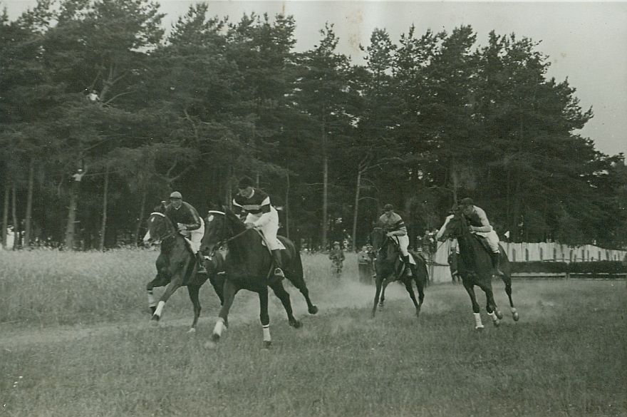 | Nr. inwentarzowy: MŁJ-XVI 1746 / 00 / 030 opis: Tor wyścigów konnych, steeple-chase. Po zielonej bieżni galopują 4 konie. Od lewej: Nic ci do tego pod. M. Bohdanowiczem, Herod pod Karolem Rómmlem, Tenówna pod Janem Goszczyńskim i Felka pod B. Miklewskim. Jeźdźcy w strojach wyścigowych. Konie, poza Tenówną, z bandażami na przednich nogach. W tle ogrodzenie, szpilkowy las.czas powstania - daty graniczne: 1936-07-02 - 1936-07-02miejsce: Wilno, Pośpieszka.osoby: Rtm. Michał Bohdanowicz "Miś" (1903-1948), 13 p.u., dowódca 1 szwadronu "Tatarskiego". Ppłk Karol Rómmel, wybitny jeździec, olimpijczyk, od 1929 r. w stanie spoczynku. Por. Jan Goszczyński (1896-?), 5 DAK, właściciel stajni wyścigowej. Por. Bohdan Miklewski (1898-1944), 13 p.u., później 12 p.u.tworzywo: papier fotograficzny, błyszczącytechnika: odbitka żelatynowo-srebrowa DOP, czarno-białazespół: album rodziny Leskichwymiary (wys. x szer.): 87 x 127 [mm] Konie: 1. Nic ci do tego - koń, na którym M. Bohdanowicz startował w steeple-chase. 2. Herod - Balthazar - Brol. Koń, na którym w steeple-chasse startował K. Rómmel. Dosiadał go też M. Bohdanowicz. 3. Tenówna, klacz - koń, na którym J. Goszczyński startował w steeple-chase. 4. Felka, klacz, rasa: xx, maść gniada, ur. 1931 - po Svengali i Walkirja, hod. Janusza Michelisa, wł. por. Edwarda Tudzińskiego; w 1935 biegała w gonitwach płotowych w Poznaniu, Wilnie, Lublinie; startowała także w steeple-chase pod por. E. Tudzińskim i por. B. Miklewskim.