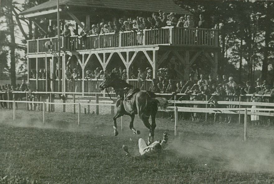 | Nr. inwentarzowy: MŁJ-XVI 1746 / 00 / 021 opis: Tor wyścigów konnych, Steeple-chase im. Brygady K.O.P. Wilno. Upadek po skoku - Edward Tudziński leży na trawiastej bieżni po upadku z kl. Felka. Jeździec w stroju wyścigowym (jasne bryczesy, kolorowa kurtka). Za barierą drewniana, piętrowa trybuna wypełniona publicznością, kilka drzew. Niewidoczne na zdjęciu: wygrała kl. Złota Pantera - Paweł Bierzyński, 2. m. koń Natan R - dr Zajączkowski.czas powstania - daty graniczne: 1936-06-28 - 1936-06-28miejsce: Wilno, Pośpieszka.osoby: Edward Tudziński (por. w szwadronie zapasowym 26 p.u., właściciel stajni wyścigowej – barwy: E. Tudziński: k. i r. różowe, sz. i cz. czarne), jego konie startowały we Lwowie, Wilnie, Baranowiczach); niewidoczni: rtm. Paweł Bierzyński (1897-1946), od 1931 w 6 p.s.k. - d-ca szwadronu zapasowego; dr Zajączkowski.tworzywo: papier fotograficzny, błyszczącytechnika: odbitka żelatynowo-srebrowa DOP, czarno-białazespół: album rodziny Leskichwymiary (wys. x szer.): 86 x 126 [mm] Konie: 1. Felka, klacz, rasa: xx, maść gniada, ur. 1931 - po Svengali i Walkirja, hod. Janusza Michelisa, wł. por. Edwarda Tudzińskiego; w 1935 biegała w gonitwach płotowych w Poznaniu, Wilnie, Lublinie; startowała także w steeple-chase pod por. E. Tudzińskim i por. B. Miklewskim. 2. Złota Pantera, klacz - koń, na którym w steeple-chase startował P. Bierzyński. 3. Natan R - koń, na którym w steeple-chase startował dr Zajączkowski.